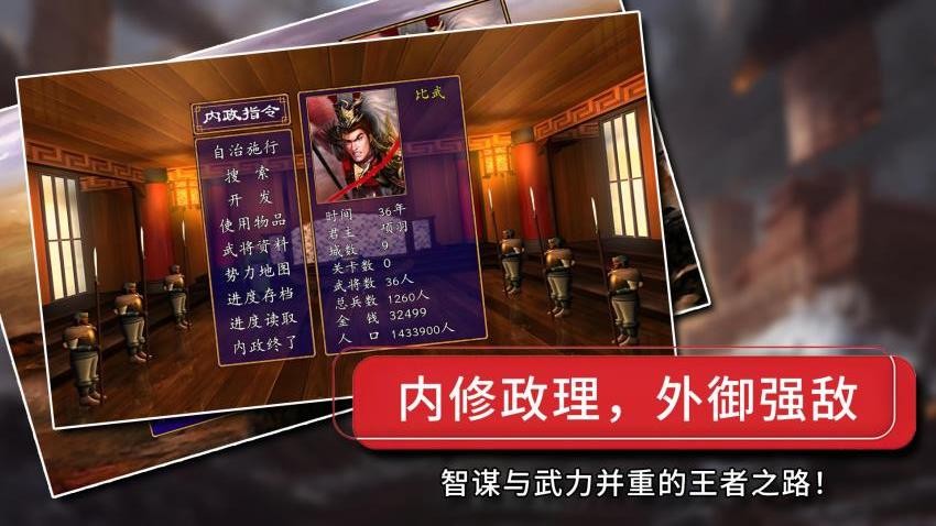 诸侯天下:秦朝灭亡,项羽自立为西楚霸王,并分封各地诸侯。游戏中各地诸侯都有较强的势力,项羽实力最为强劲。